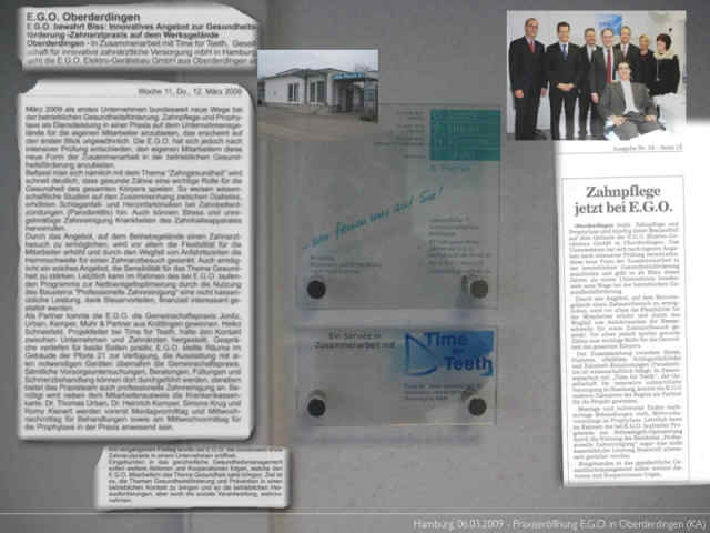 Hamburg, im März 2009Am 6. März 2009 wurde die erste deutsche Zahngesundheits-Praxis als Time for Teeth Service der E.G.O. Elektro-Gerätebau GmbH übergeben. Wir konnten die namhafte zahnärtzliche Gemeinschaftspraxis Dr. Jonitz, Dr. Urban, Dr. Kemper, T. Muhr und Partner als Zahngesundheitspartner für diesen wichtigen Meilenstein in unserer jungen Unternehmensgeschichte gewinnen.